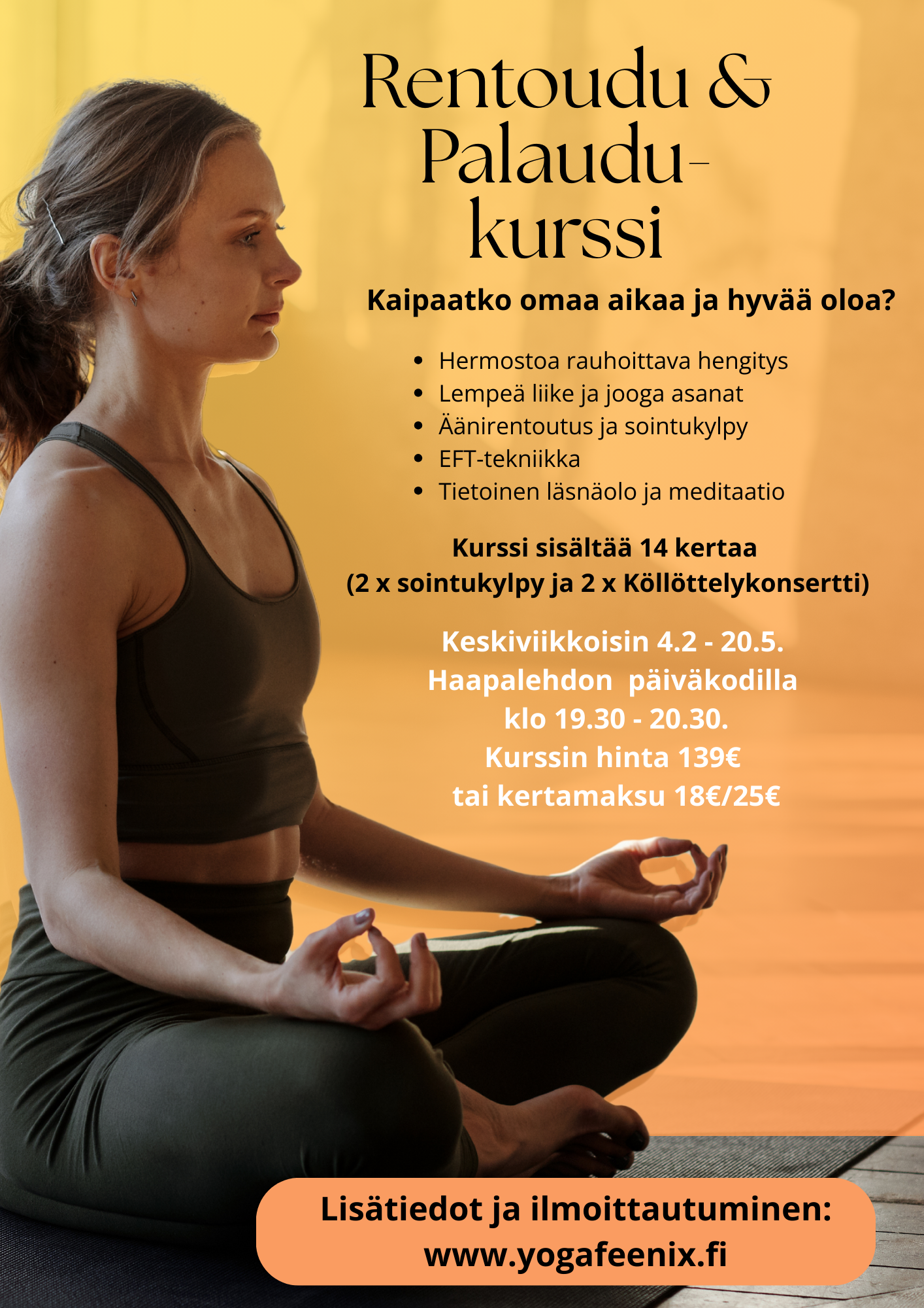 Tällä kurssilla opit rentouttamaan hermostoa, palautumaan fyysisesti sekä rauhoittamaan mieltä erilaisilla menetelmillä. Kevätkausi sisältää yhteensä 17 erilaista kurssi kertaa. Kurssilla teemme erilaisia kehollisia rentoutumismenetelmiä mm. syvävenyttelyä, lempeää hathajoogaa, yinjoogaa, mielikuvaharjoituksia sekä kurssi sisältää myös kerran kuussa äänirentoutumista. Sointukylpyjä pidetään tammi-, maalis- ja huhtikuussa, sekä köllöttelykonsertteja yhteistyössä Pianoballadisti Heikki Hallanoron kanssa helmi- ja toukokuussa.